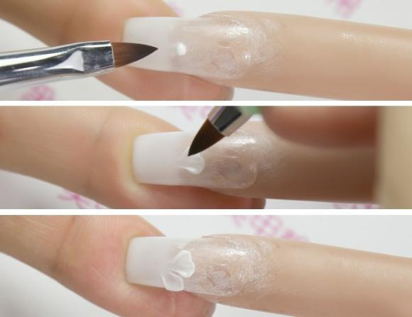 我们用雕花笔勾出一小块雕花胶,放到指甲上,然后用雕花笔笔尖点在雕花胶的一个边上,然后往另一边轻轻按压,按出花瓣的效果!然后照干,再做其他花瓣。